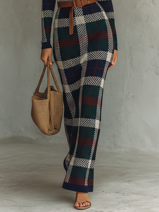 Ena | Vestido Largo de Punto a Cuadros con Cuello Cuadrado y Cinturón