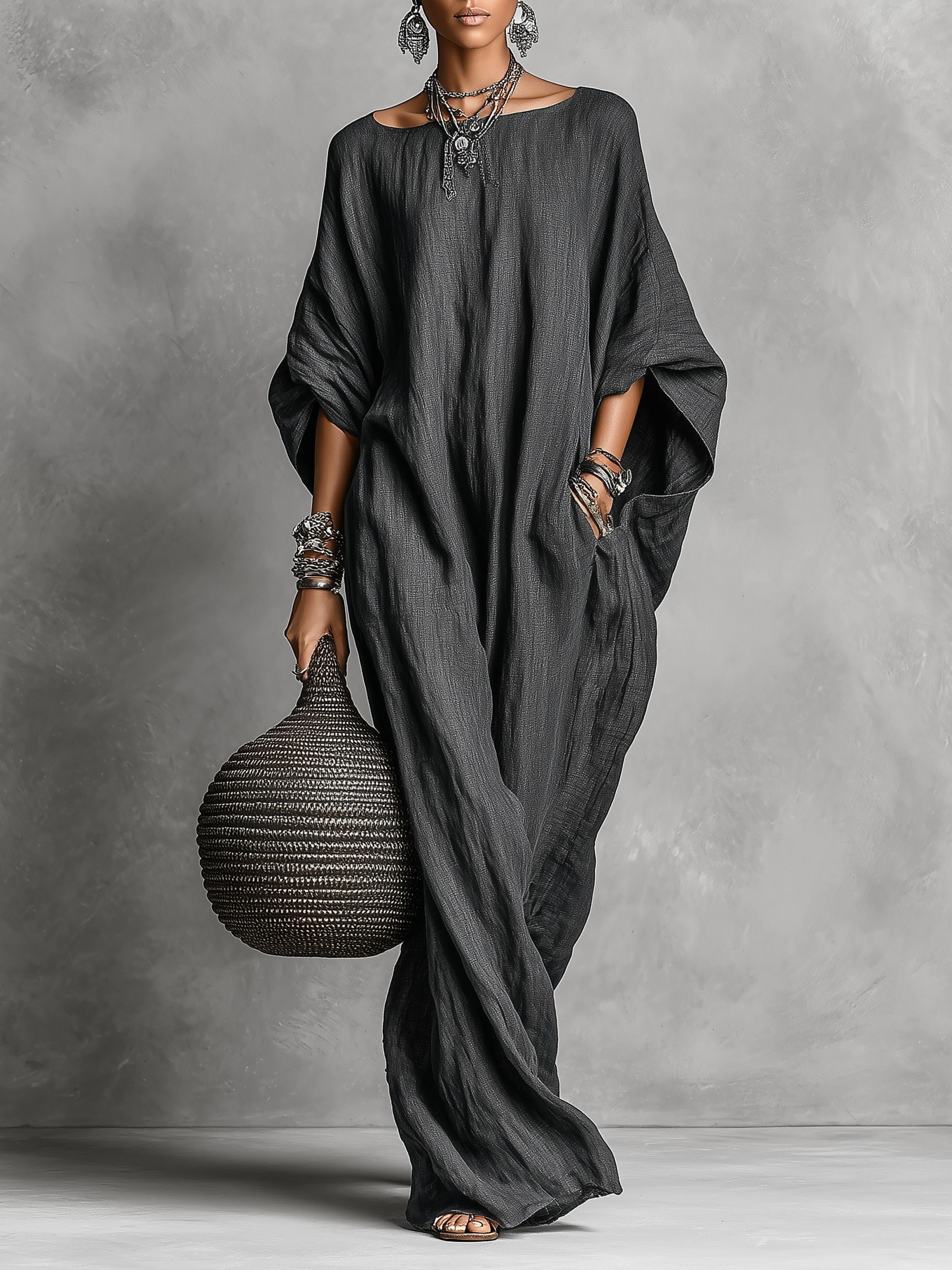 El vestido largo Emira holgado y de lino con mangas murciélago, combina fluidez y estilo natural en una silueta minimalista. Su corte amplio aporta movimiento y comodidad, mientras que el cuello redondo mantiene una estética limpia y versátil. El diseño maxi y las mangas murciélago crean un look relajado y elegante, ideal para quienes buscan sofisticación sin esfuerzo.
