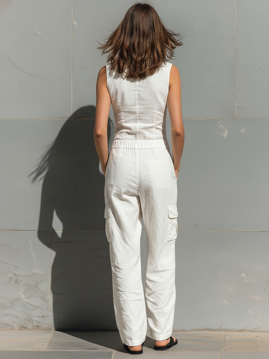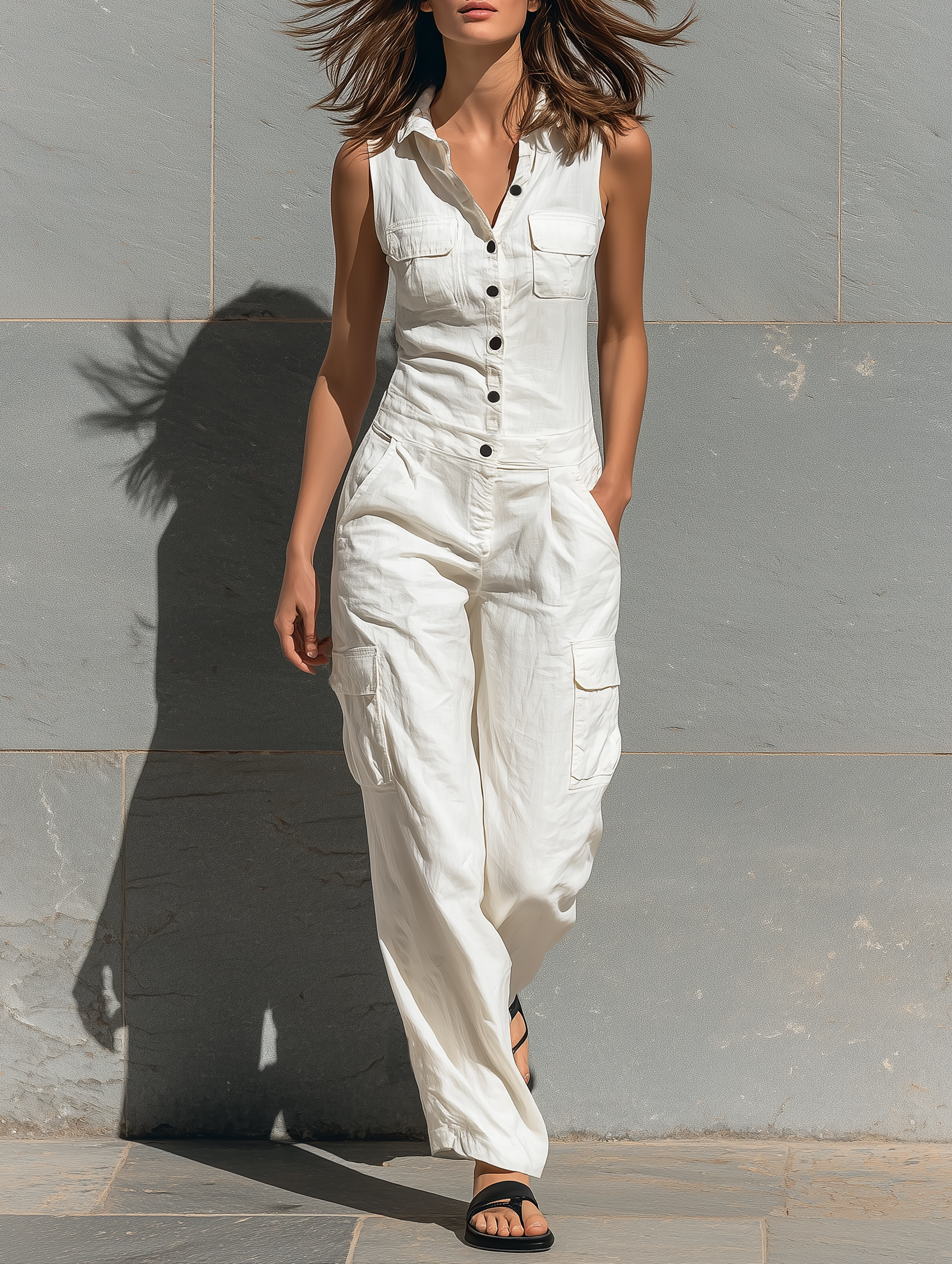 El mono Macarena es un mono minimalista sin mangas con botones que combina líneas limpias y elegancia funcional. Confeccionado en una silueta entallada de ajuste regular, presenta un escote en V que estiliza la parte superior y un distintivo detalle de un solo botón frontal que aporta un toque moderno y sofisticado. Su diseño de una sola pieza y largo completo crea una figura estilizada y versátil, ideal para looks pulidos tanto de día como en ocasiones más formales.