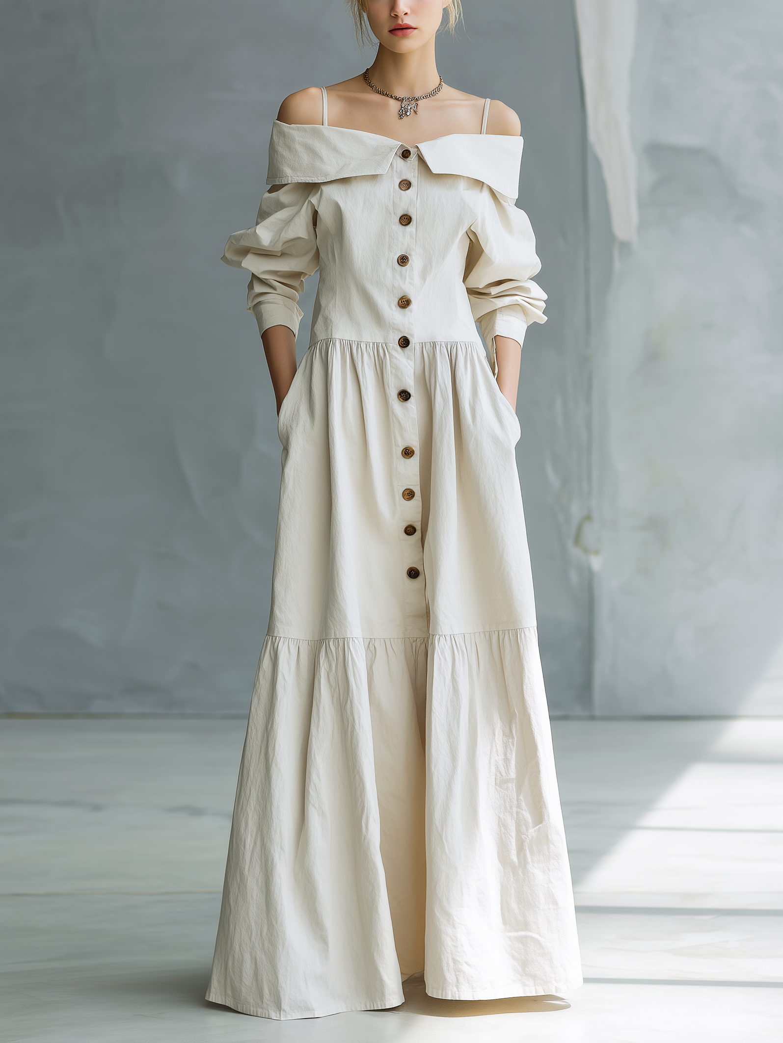 El vestido Maré es un vestido camisero tejido con hombros descubiertos y mangas sueltas que combina romanticismo y elegancia relajada. Su diseño de hombros descubiertos realza delicadamente la clavícula, mientras que las mangas largas y amplias aportan movimiento y sofisticación. La silueta fluida de corte holgado estiliza sin ceñir, creando un efecto etéreo y femenino ideal para los días cálidos. De largo completo y acabado ligero, es una pieza versátil que transmite refinamiento sin esfuerzo.