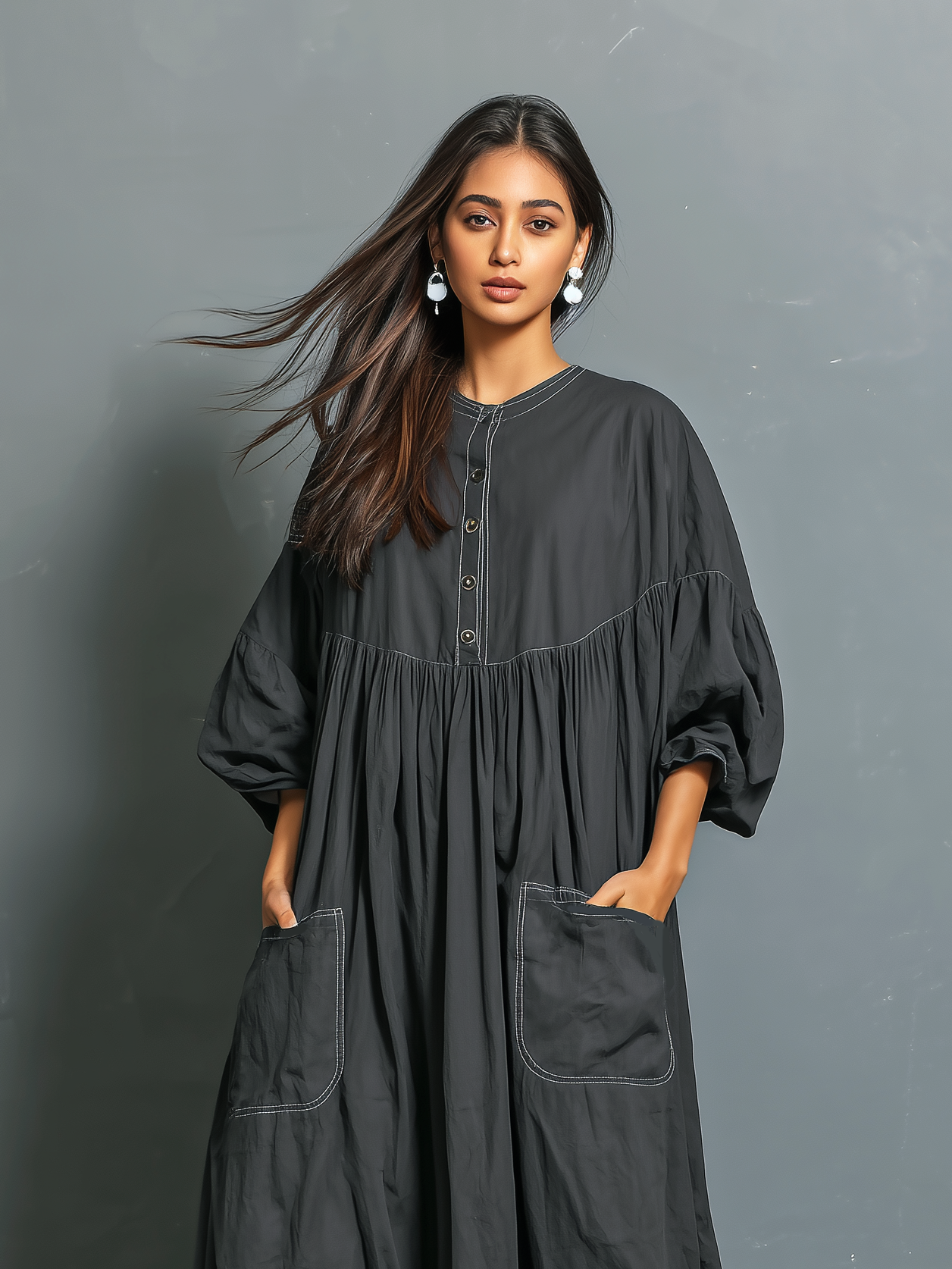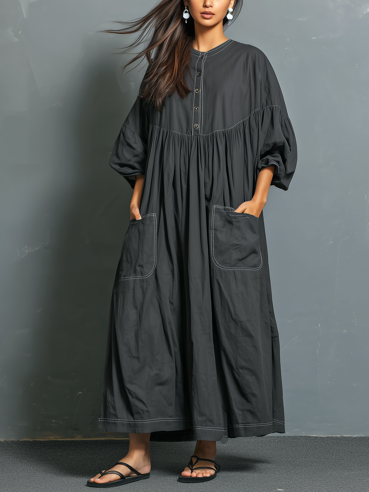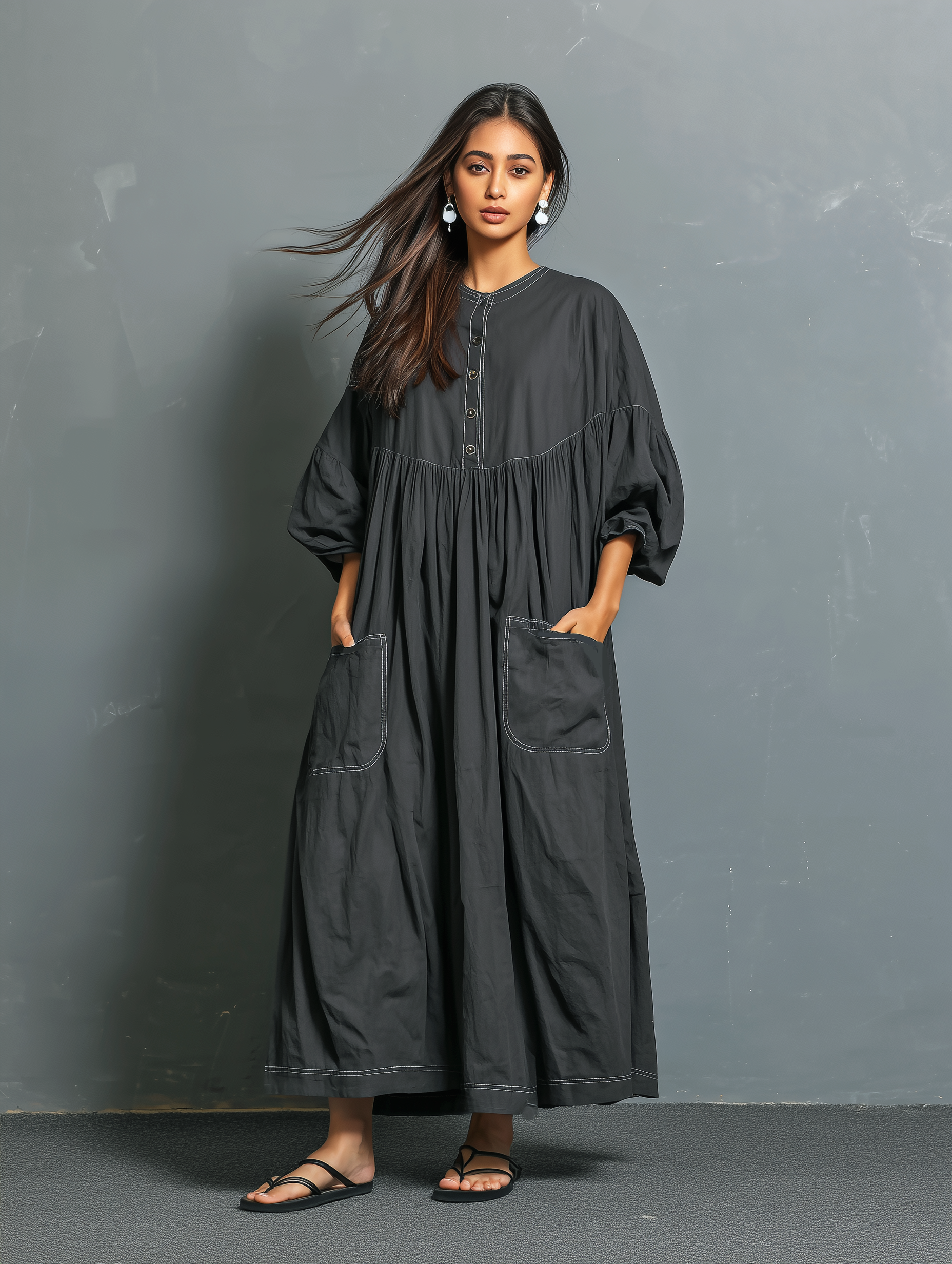 El vestido Umbra es un vestido largo holgado de manga media que combina comodidad y estilo atemporal en un diseño versátil. Confeccionado en un elegante tono gris oscuro, presenta escote redondo clásico y una silueta suelta y fluida que permite movimiento natural y confort durante todo el día. Su diseño minimalista lo convierte en una pieza esencial para looks relajados con un toque refinado.